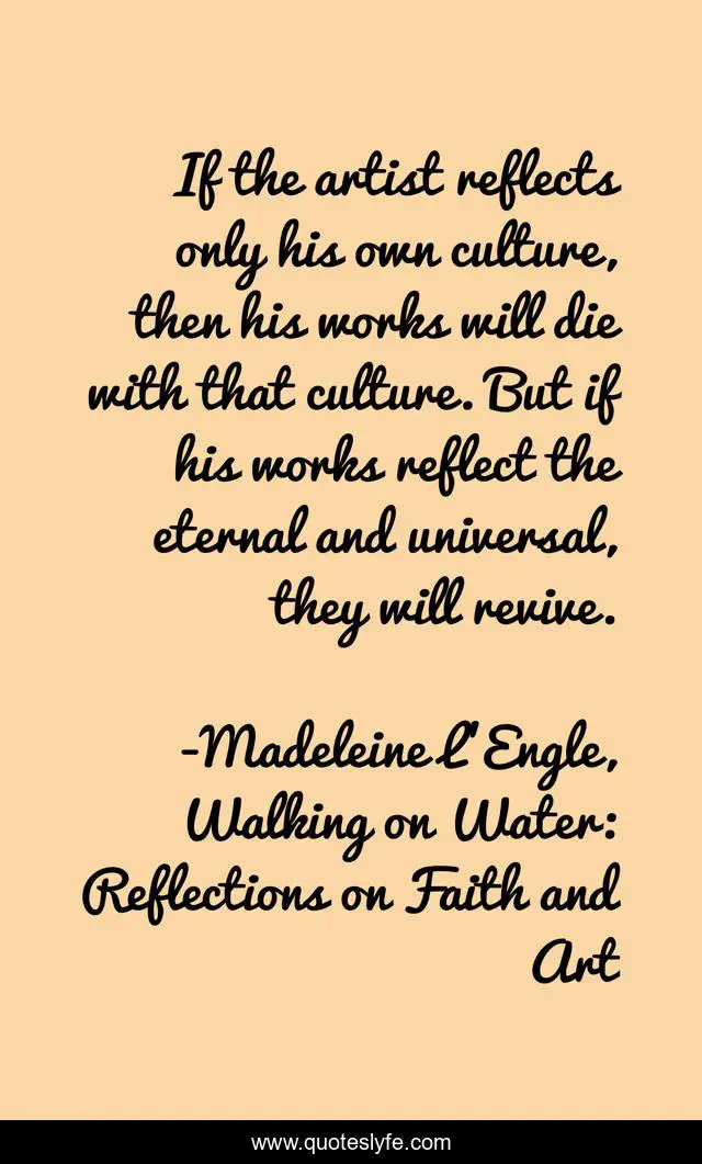 This page presents the quote "If the artist reflects only his own culture, then his works will die with that culture. But if his works reflect the eternal and universal, they will revive.". Author of this quote is Madeleine L'Engle, Walking on Water: Reflections on Faith and Art. This quote is about universal, popularity, art, remember,.