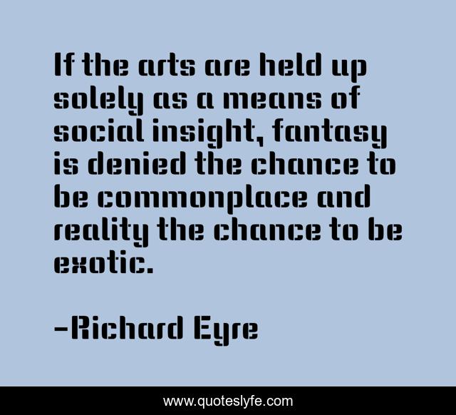 This page presents the quote "If the arts are held up solely as a means of social insight, fantasy is denied the chance to be commonplace and reality the chance to be exotic.". Author of this quote is Richard Eyre. This quote is about fantasy, insight, reality,.