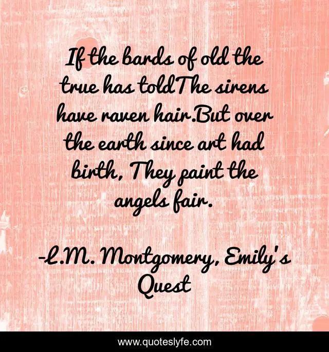 This page presents the quote "If the bards of old the true has toldThe sirens have raven hair.But over the earth since art had birth, They paint the angels fair.". Author of this quote is L.M. Montgomery, Emily's Quest. This quote is about sirens, angels,.