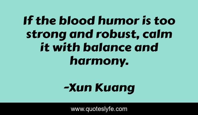 This page presents the quote "If the blood humor is too strong and robust, calm it with balance and harmony.". Author of this quote is Xun Kuang. This quote is about balance, calm, strong,.