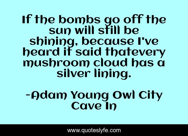 This page presents the quote "If the bombs go off the sun will still be shining, because I've heard it said thatevery mushroom cloud has a silver lining.". Author of this quote is Adam Young Owl City Cave In. This quote is about life, optimism, inspirational, song-lyrics, enthusiasm, tragedy, hope,.