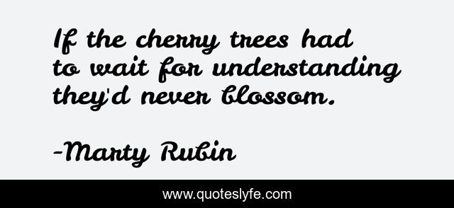 This page presents the quote "If the cherry trees had to wait for understanding they'd never blossom.". Author of this quote is Marty Rubin. This quote is about action, spontaneity, understanding,.