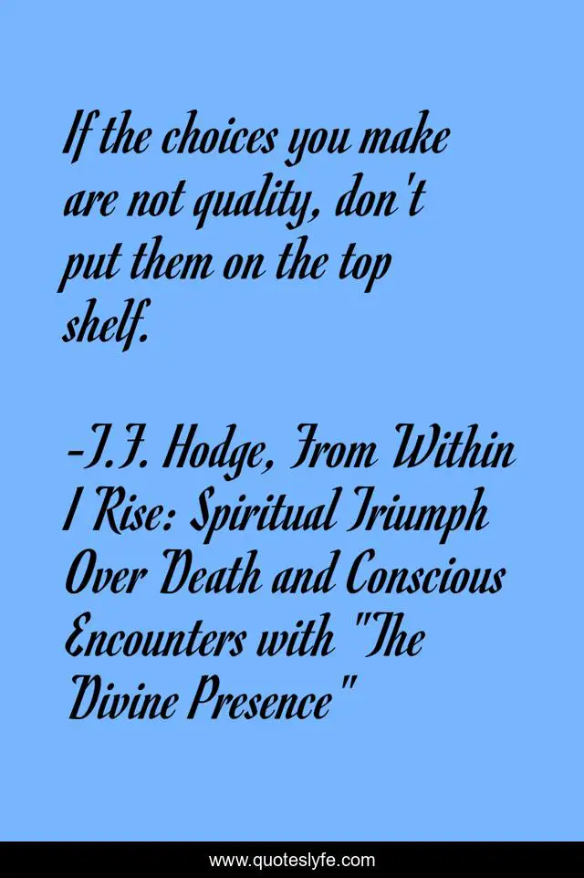 This page presents the quote "If the choices you make are not quality, don't put them on the top shelf.". Author of this quote is T.F. Hodge, From Within I Rise: Spiritual Triumph Over Death and Conscious Encounters with "The Divine Presence". This quote is about decisions, choices, quality, selections,.
