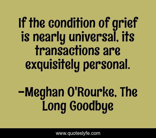 This page presents the quote "If the condition of grief is nearly universal, its transactions are exquisitely personal.". Author of this quote is Meghan O'Rourke, The Long Goodbye. This quote is about grief, human-condition, death-and-dying,.