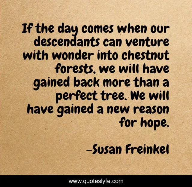 This page presents the quote "If the day comes when our descendants can venture with wonder into chestnut forests, we will have gained back more than a perfect tree. We will have gained a new reason for hope.". Author of this quote is Susan Freinkel. This quote is about conservation, forests, trees, hope,.