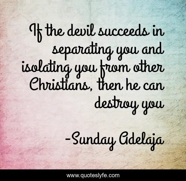 This page presents the quote "If the devil succeeds in separating you and isolating you from other Christians, then he can destroy you". Author of this quote is Sunday Adelaja. This quote is about prosperity, reality-of-life, devil, wealth, succeeds, money, riches, destroy, truth-of-life,.