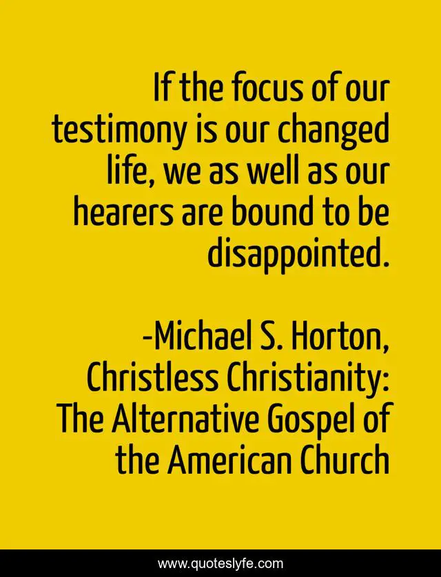 This page presents the quote "If the focus of our testimony is our changed life, we as well as our hearers are bound to be disappointed.". Author of this quote is Michael S. Horton, Christless Christianity: The Alternative Gospel of the American Church. This quote is about gospel, testimony,.
