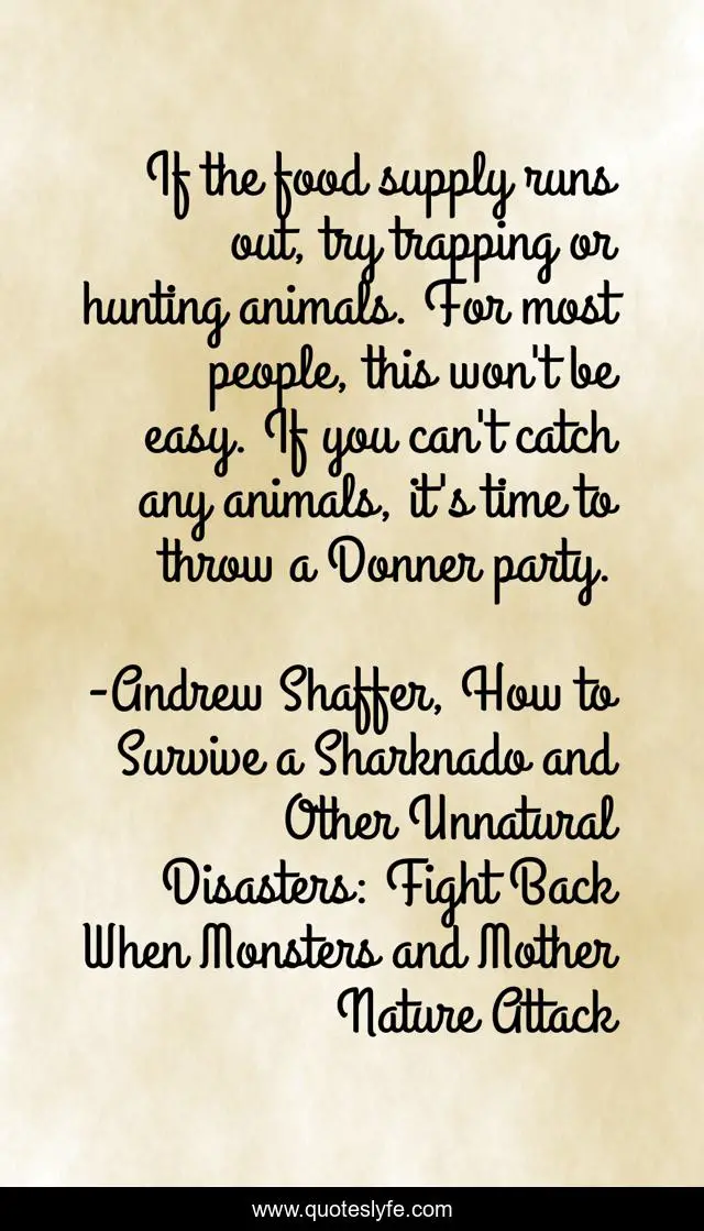 This page presents the quote "If the food supply runs out, try trapping or hunting animals. For most people, this won't be easy. If you can't catch any animals, it's time to throw a Donner party.". Author of this quote is Andrew Shaffer, How to Survive a Sharknado and Other Unnatural Disasters: Fight Back When Monsters and Mother Nature Attack. This quote is about survival, humor, history,.