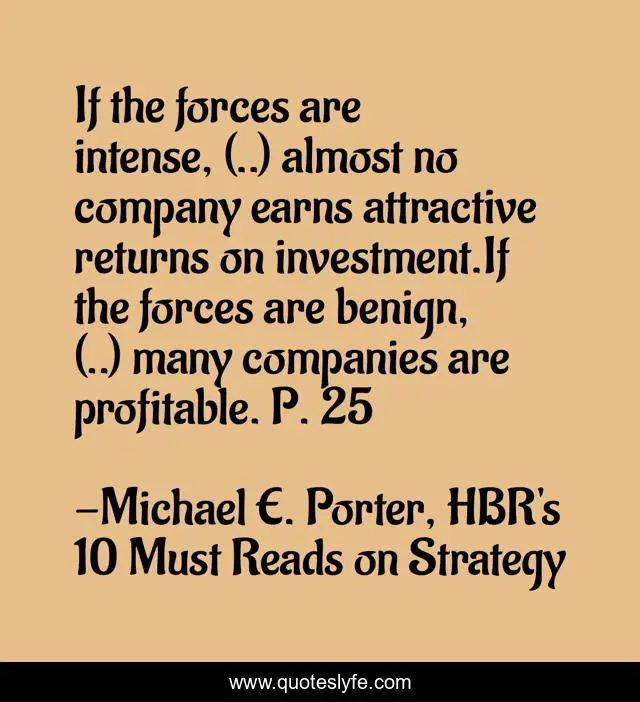 This page presents the quote "If the forces are intense, (..) almost no company earns attractive returns on investment.If the forces are benign, (..) many companies are profitable. P. 25". Author of this quote is Michael E. Porter, HBR's 10 Must Reads on Strategy. This quote is about strategic, competitive-forces, competition, strategy,.