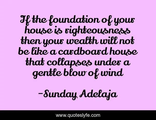 This page presents the quote "If the foundation of your house is righteousness then your wealth will not be like a cardboard house that collapses under a gentle blow of wind". Author of this quote is Sunday Adelaja. This quote is about blow, foundation, righteousness, wealth, prosperity, money, riches, house, cardboard,.