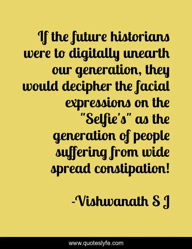 This page presents the quote "If the future historians were to digitally unearth our generation, they would decipher the facial expressions on the "Selfie's" as the generation of people suffering from wide spread constipation!". Author of this quote is Vishwanath S J. This quote is about selfie-stick, humor, selfie, time-travel, fiction, fantasy, disorder,.