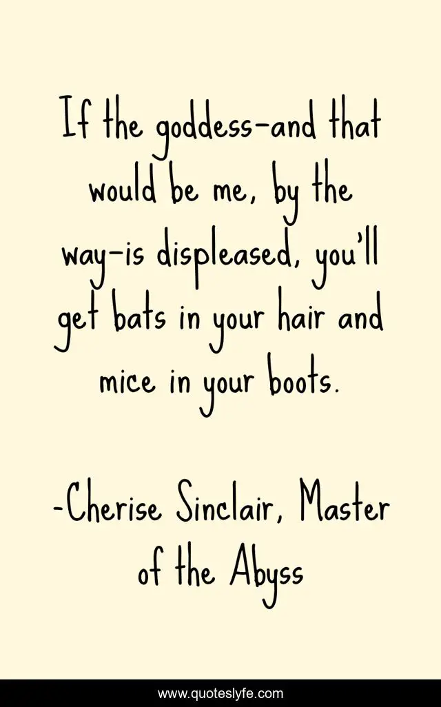 This page presents the quote "If the goddess—and that would be me, by the way—is displeased, you’ll get bats in your hair and mice in your boots.". Author of this quote is Cherise Sinclair, Master of the Abyss. This quote is about erotica, master-of-the-abyss, cherise-sinclair,.