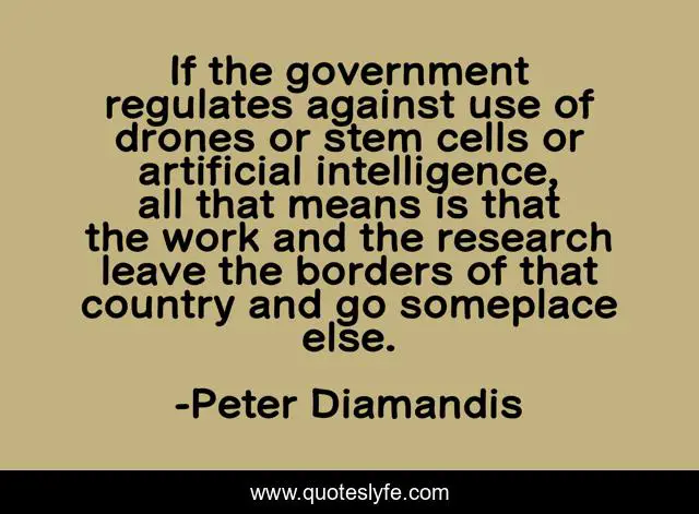 This page presents the quote "If the government regulates against use of drones or stem cells or artificial intelligence, all that means is that the work and the research leave the borders of that country and go someplace else.". Author of this quote is Peter Diamandis. This quote is about government, work, research,.