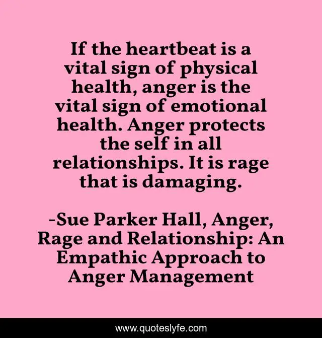 This page presents the quote "If the heartbeat is a vital sign of physical health, anger is the vital sign of emotional health. Anger protects the self in all relationships. It is rage that is damaging.". Author of this quote is Sue Parker Hall, Anger, Rage and Relationship: An Empathic Approach to Anger Management. This quote is about anger, emotional-health, anger-management,.