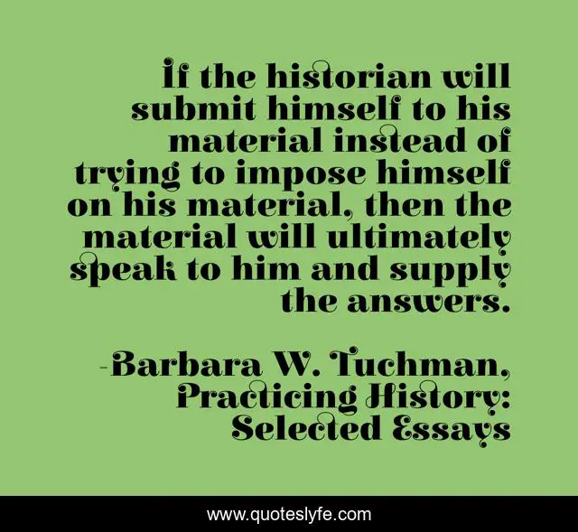 This page presents the quote "If the historian will submit himself to his material instead of trying to impose himself on his material, then the material will ultimately speak to him and supply the answers.". Author of this quote is Barbara W. Tuchman, Practicing History: Selected Essays. This quote is about writers, history, writing,.