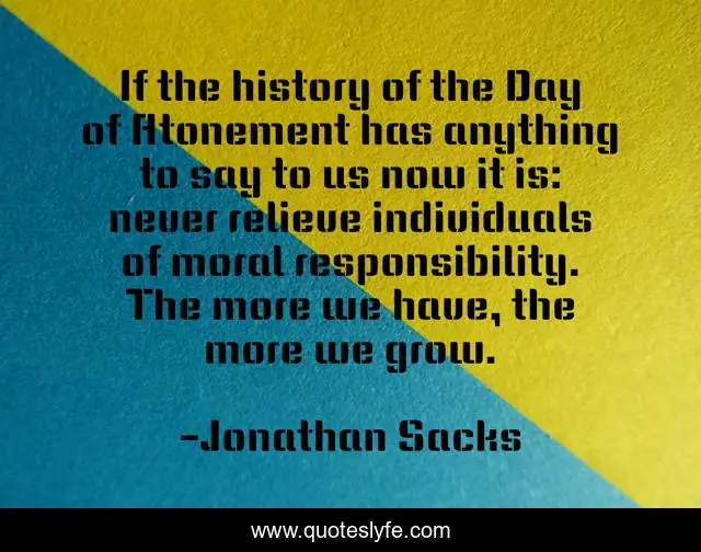 This page presents the quote "If the history of the Day of Atonement has anything to say to us now it is: never relieve individuals of moral responsibility. The more we have, the more we grow.". Author of this quote is Jonathan Sacks. This quote is about responsibility, moral, day,.