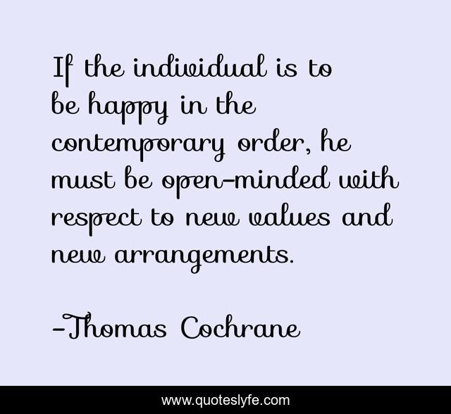 This page presents the quote "If the individual is to be happy in the contemporary order, he must be open-minded with respect to new values and new arrangements.". Author of this quote is Thomas Cochrane. This quote is about be happy, values, happy,.