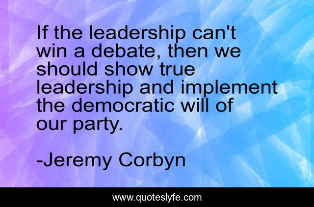 This page presents the quote "If the leadership can't win a debate, then we should show true leadership and implement the democratic will of our party.". Author of this quote is Jeremy Corbyn. This quote is about win, debate, party,.