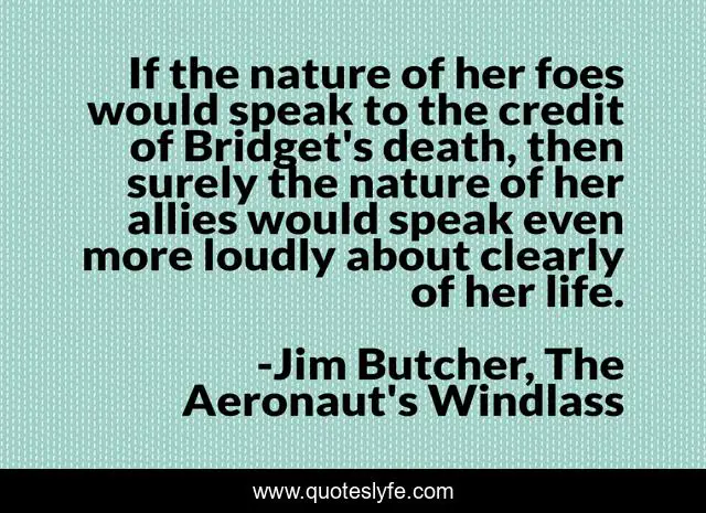 This page presents the quote "If the nature of her foes would speak to the credit of Bridget's death, then surely the nature of her allies would speak even more loudly about clearly of her life.". Author of this quote is Jim Butcher, The Aeronaut's Windlass. This quote is about foes, life, death, allies, honour, character, friends, honor, enemies,.