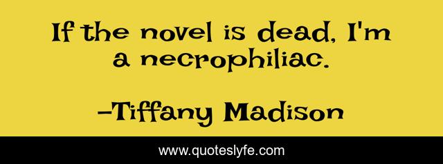 This page presents the quote "If the novel is dead, I'm a necrophiliac.". Author of this quote is Tiffany Madison. This quote is about novel, publishing, reading-books, reading-readers-writers, writing, writing-philosophy, reading,.