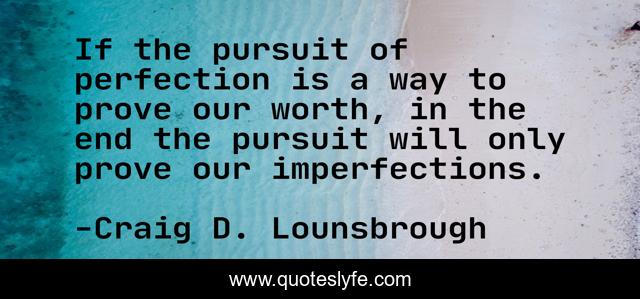 This page presents the quote "If the pursuit of perfection is a way to prove our worth, in the end the pursuit will only prove our imperfections.". Author of this quote is Craig D. Lounsbrough. This quote is about self-confidence, prove, self-loathing, value, self-worth, self-hatred, imperfections, pursuit, pursuing,.
