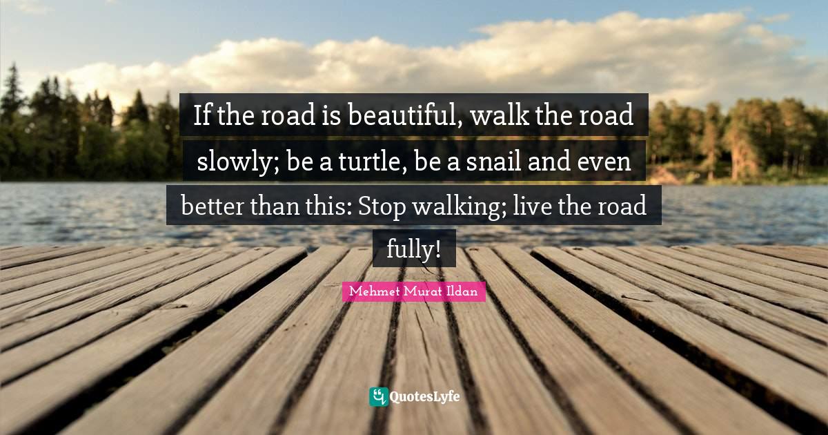 This page presents the quote "If the road is beautiful, walk the road slowly; be a turtle, be a snail and even better than this: Stop walking; live the road fully!". Author of this quote is Mehmet Murat Ildan. This quote is about beautiful, walking, turtles, snail,.