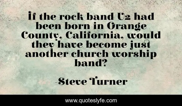 This page presents the quote "If the rock band U2 had been born in Orange County, California, would they have become just another church worship band?". Author of this quote is Steve Turner. This quote is about creativity, uniqueness, passion, adversity, testimony,.