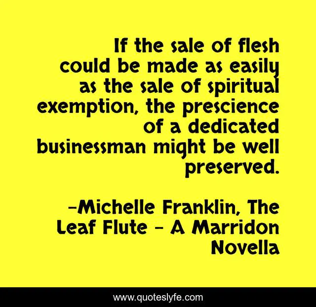 This page presents the quote "If the sale of flesh could be made as easily as the sale of spiritual exemption, the prescience of a dedicated businessman might be well preserved.". Author of this quote is Michelle Franklin, The Leaf Flute - A Marridon Novella. This quote is about commentary, satire, slavery, business, religion,.