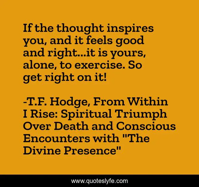 This page presents the quote "If the thought inspires you, and it feels good and right...it is yours, alone, to exercise. So get right on it!". Author of this quote is T.F. Hodge, From Within I Rise: Spiritual Triumph Over Death and Conscious Encounters with "The Divine Presence". This quote is about inspire, rights, ideas, quotes, thoughts, achieve, inspiration,.