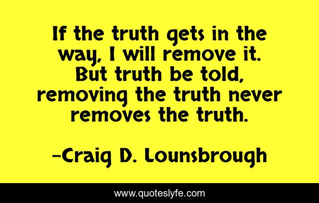 This page presents the quote "If the truth gets in the way, I will remove it. But truth be told, removing the truth never removes the truth.". Author of this quote is Craig D. Lounsbrough. This quote is about control, truthfulness, agenda, convenient, priorities, arrogance, convenience, remove, truth,.