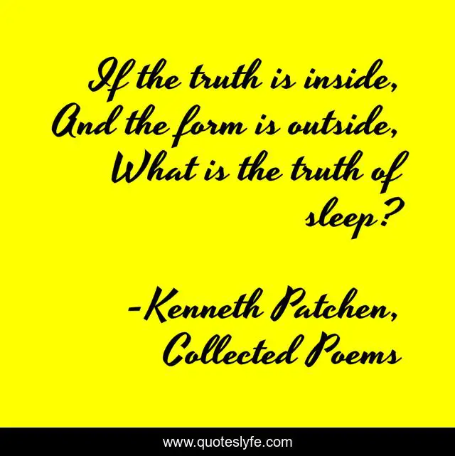 This page presents the quote "If the truth is inside, And the form is outside, What is the truth of sleep?". Author of this quote is Kenneth Patchen, Collected Poems. This quote is about sleep, truth, reality,.