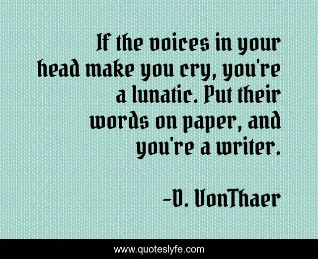 This page presents the quote "If the voices in your head make you cry, you're a lunatic. Put their words on paper, and you're a writer.". Author of this quote is D. VonThaer. .