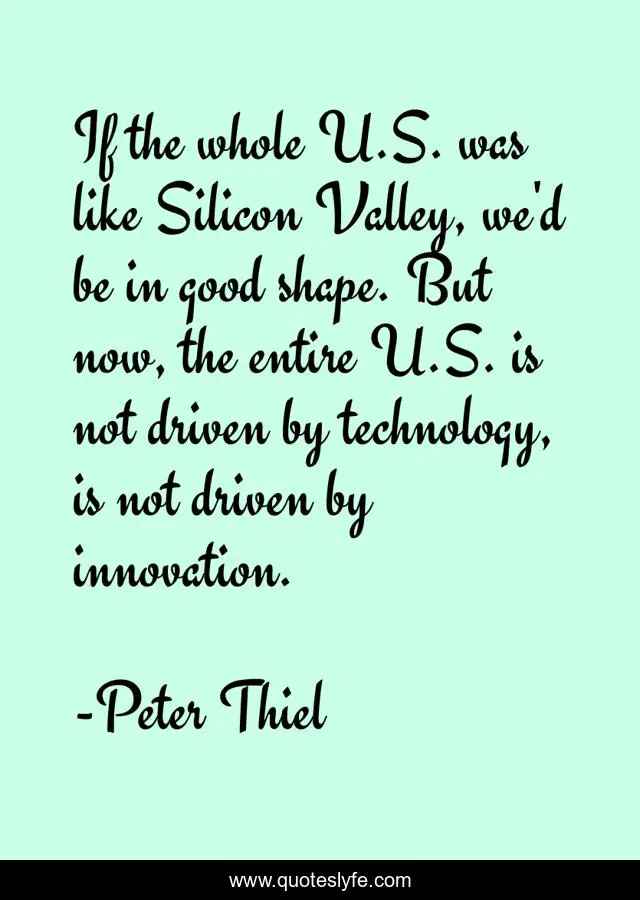 This page presents the quote "If the whole U.S. was like Silicon Valley, we'd be in good shape. But now, the entire U.S. is not driven by technology, is not driven by innovation.". Author of this quote is Peter Thiel. This quote is about shape, good, innovation,.
