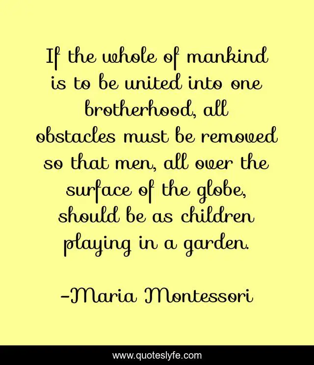 This page presents the quote "If the whole of mankind is to be united into one brotherhood, all obstacles must be removed so that men, all over the surface of the globe, should be as children playing in a garden.". Author of this quote is Maria Montessori. This quote is about obstacles, children, garden,.
