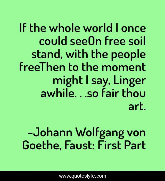 This page presents the quote "If the whole world I once could seeOn free soil stand, with the people freeThen to the moment might I say, Linger awhile. . .so fair thou art.". Author of this quote is Johann Wolfgang von Goethe, Faust: First Part. This quote is about moments, freedom, passage-of-time, time, world,.