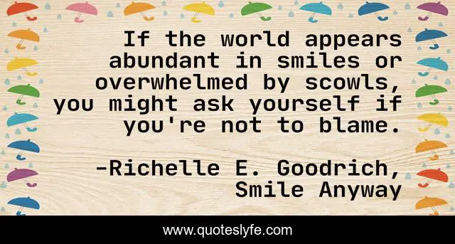 This page presents the quote "If the world appears abundant in smiles or overwhelmed by scowls, you might ask yourself if you're not to blame.". Author of this quote is Richelle E. Goodrich, Smile Anyway. This quote is about reactions, responses, rebound, echo, reciprocate, richelle, richelle-goodrich, cause-and-effect, smile,.