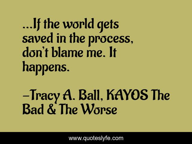 This page presents the quote "...If the world gets saved in the process, don’t blame me. It happens.". Author of this quote is Tracy A. Ball, KAYOS The Bad & The Worse. This quote is about fun, romance, adventure,.