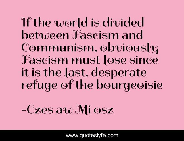 This page presents the quote "If the world is divided between Fascism and Communism, obviously Fascism must lose since it is the last, desperate refuge of the bourgeoisie". Author of this quote is Czesław Miłosz. This quote is about facsim, bourgeoisie, communism, captive-mind,.