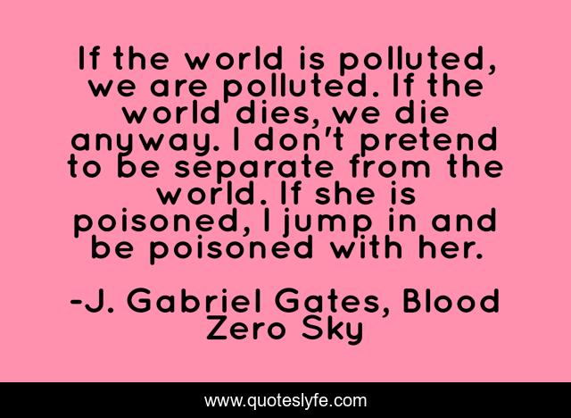 This page presents the quote "If the world is polluted, we are polluted. If the world dies, we die anyway. I don't pretend to be separate from the world. If she is poisoned, I jump in and be poisoned with her.". Author of this quote is J. Gabriel Gates, Blood Zero Sky. .