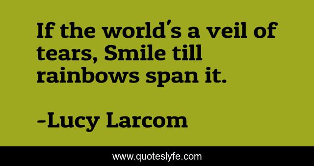 This page presents the quote "If the world's a veil of tears, Smile till rainbows span it.". Author of this quote is Lucy Larcom. This quote is about world, tears, till,.