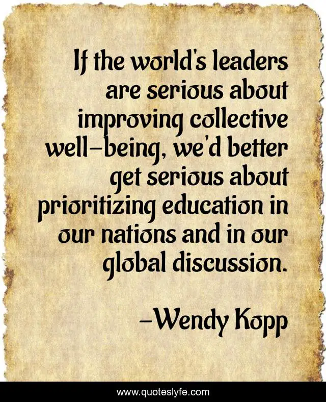 This page presents the quote "If the world's leaders are serious about improving collective well-being, we'd better get serious about prioritizing education in our nations and in our global discussion.". Author of this quote is Wendy Kopp. This quote is about better, world, well-being,.