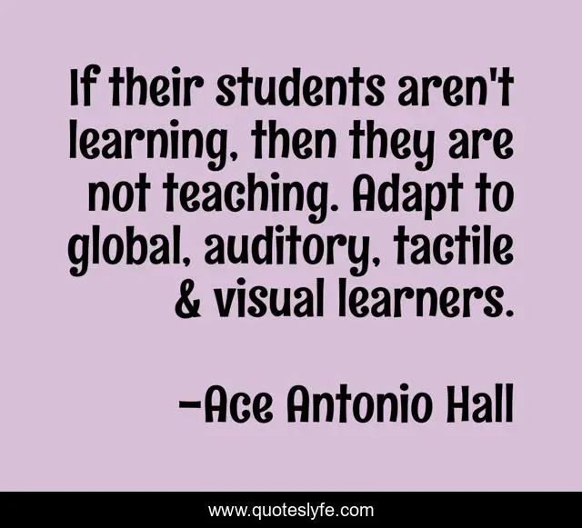 This page presents the quote "If their students aren't learning, then they are not teaching. Adapt to global, auditory, tactile & visual learners.". Author of this quote is Ace Antonio Hall. This quote is about quotes, teaching,.