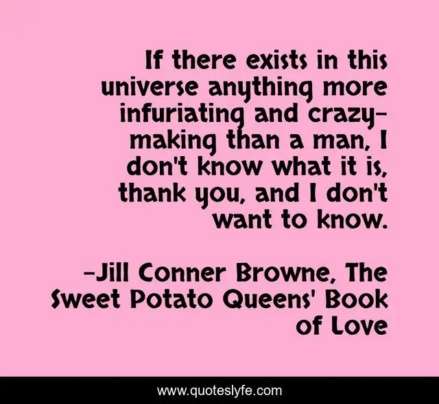 This page presents the quote "If there exists in this universe anything more infuriating and crazy-making than a man, I don't know what it is, thank you, and I don't want to know.". Author of this quote is Jill Conner Browne, The Sweet Potato Queens' Book of Love. .