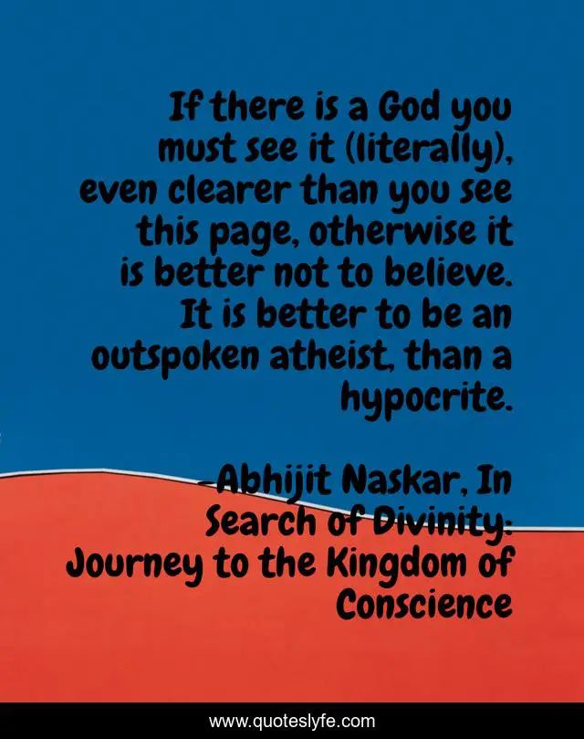This page presents the quote "If there is a God you must see it (literally), even clearer than you see this page, otherwise it is better not to believe. It is better to be an outspoken atheist, than a hypocrite.". Author of this quote is Abhijit Naskar, In Search of Divinity: Journey to the Kingdom of Conscience. This quote is about faith, divinity, god, philosophy, kingdom-of-god, atheist, faith-vs-reason, meditation, transcendence,.