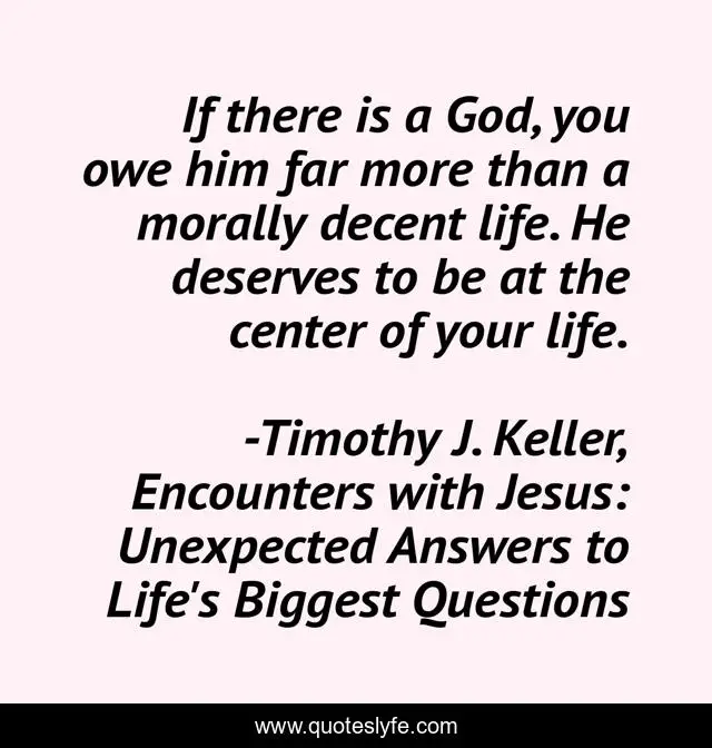 This page presents the quote "If there is a God, you owe him far more than a morally decent life. He deserves to be at the center of your life.". Author of this quote is Timothy J. Keller, Encounters with Jesus: Unexpected Answers to Life's Biggest Questions. This quote is about faith, christianity, worship, god,.