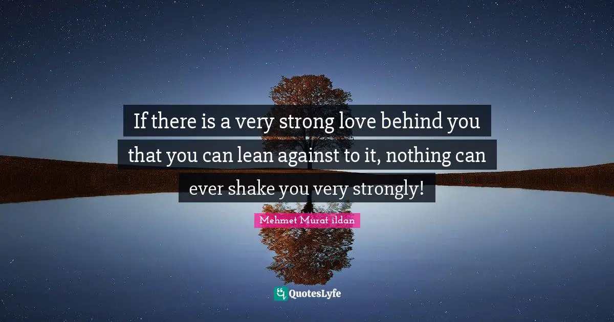 This page presents the quote "If there is a very strong love behind you that you can lean against to it, nothing can ever shake you very strongly!". Author of this quote is Mehmet Murat ildan. This quote is about lean-against, love, love-and-sayings, ildan-wise-sayings, turkish, ildan-wisdom, strong-love, leaning, lean,.