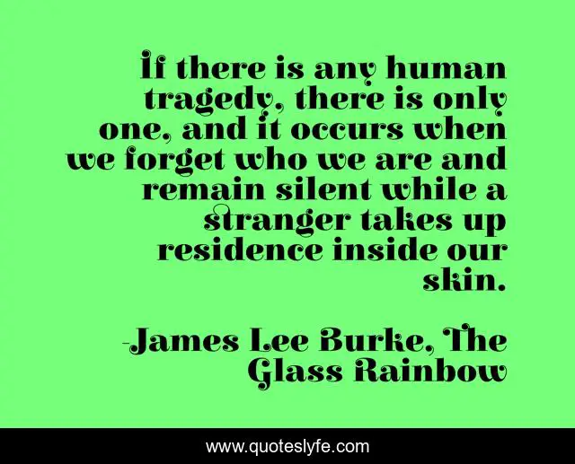 This page presents the quote "If there is any human tragedy, there is only one, and it occurs when we forget who we are and remain silent while a stranger takes up residence inside our skin.". Author of this quote is James Lee Burke, The Glass Rainbow. .
