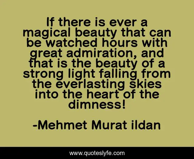 This page presents the quote "If there is ever a magical beauty that can be watched hours with great admiration, and that is the beauty of a strong light falling from the everlasting skies into the heart of the dimness!". Author of this quote is Mehmet Murat ildan. This quote is about heart, everlasting, ildan-wise-sayings, beauty, magical-beauty, ildan-wisdom, light, beauty-of-light, turkish,.