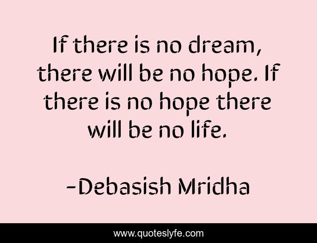 This page presents the quote "If there is no dream, there will be no hope. If there is no hope there will be no life.". Author of this quote is Debasish Mridha. This quote is about life, love, knowledge, inspirational, intelligence, philosophy, wisdom, affection, truth,.