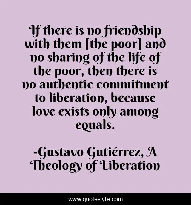 This page presents the quote "If there is no friendship with them [the poor] and no sharing of the life of the poor, then there is no authentic commitment to liberation, because love exists only among equals.". Author of this quote is Gustavo Gutiérrez, A Theology of Liberation. This quote is about god, social-justice, theology,.